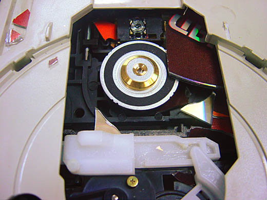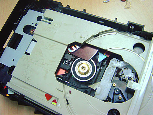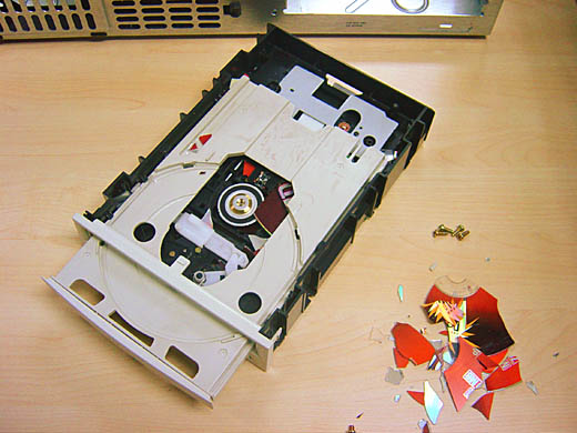 | Сегодня переписывал на работе mp3 музыку с CD на винт. Диск некоторое время крутился, после чего воспоследовал громкий хлопок, как от петарды, и шпиндель привода остановился. Выехавший трей был завален ошмётками диска. Та же картина обнаружилась и внутри. На фотографиях осколков уже меньше - часть высыпалась при разборке драйва. |