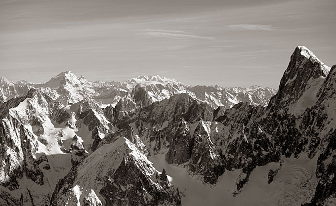 Горы над Вале Бланш (Vallee Blanche) под Монбланом, пик справа - Гранд Жорас (Grandes Jorasses, 4208 м), одна из семи знаменитых северных стен в Альпах: 1200 метров по вертикали и два километра шириной.