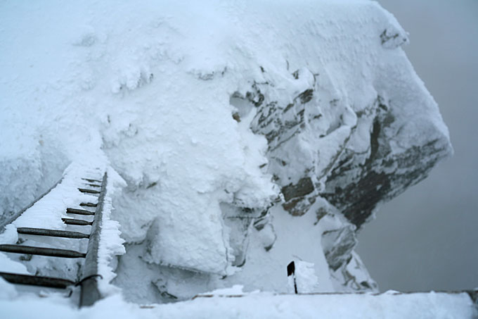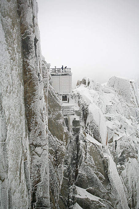 Stairway to hell. Лестница на скалы со смотровой площадки на Эгюий дю Миди (Aiguille du Midi, 3842 м). Площадку и скалы (справа от неё) можно разглядеть тут