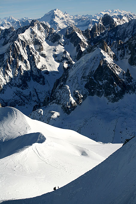Человек со сноубордом на гребне перед спуском по Вале Бланш (Vallee Blanche) под Монбланом