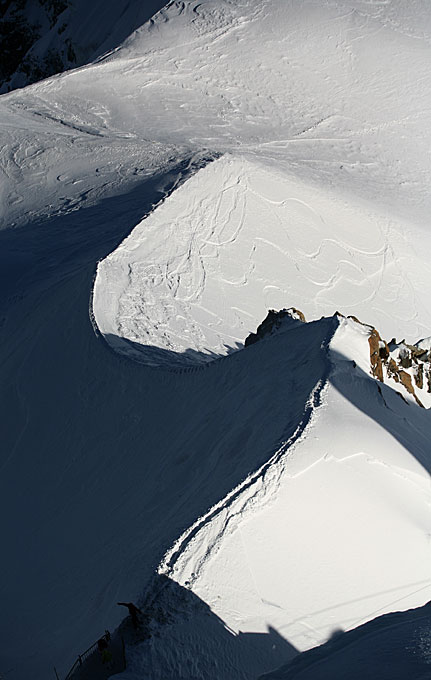 Площадка (в тени) Эгюий дю Миди (Aiguille du Midi, 3842 м) и уходящий от неё гребень на спуске в Вале Бланш (Vallee Blanche) под Монбланом.