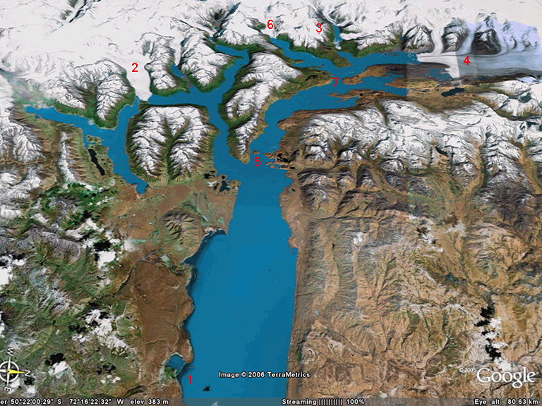 7) Айсберги - белые точки отколовшихся от Упсалы айсбергов видно даже из космоса