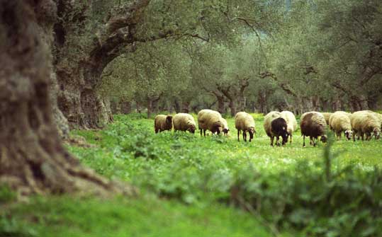 оливковыми рощами и видом пасущихся в них овец у подножия Тайгетос.