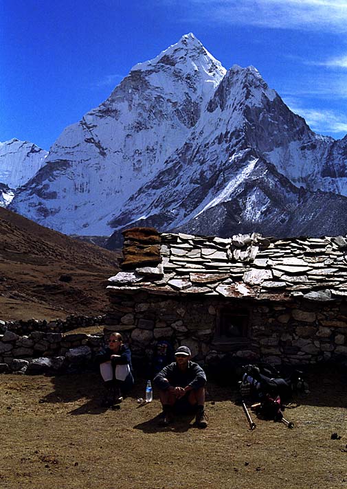 Привал у летнего домика на пастбище по пути из Дингбоче в Лобуче. Позади - Ама Даблам.