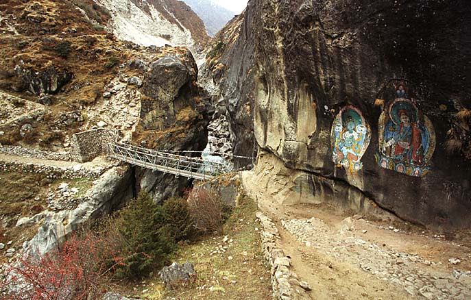 Железный подвесной мост перед Тхаме. Прекрасные будды на скале, бурный порог и причудливые камни под мостом.