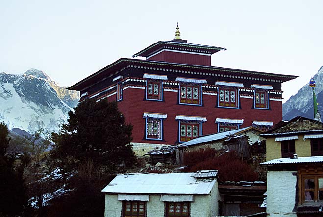 Монастырь Тенгпоче. Слева - Эверест за стеной Лхотце, справа - отроги Ама Даблам. Тенгпоче - религиозная столица страны шерпов, главное культовое сооружение Кхумбу. Подробнее о нем - тут.