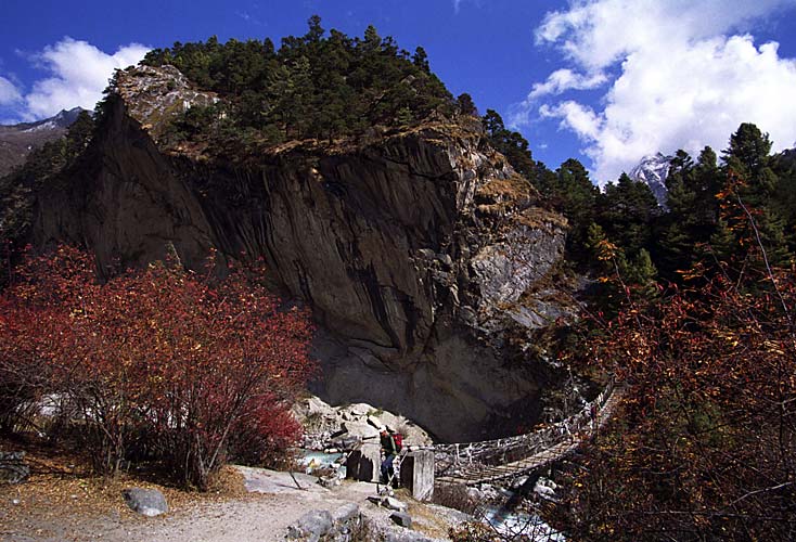 Мост через Дудх чуть ниже по течению от места его слияния с Имджой (Imja Khola). За скалой - деревня Пхунки Тенга, а там - молельные барабаны, приводимые в движение водой. За ними начинается подъем к монастырю Тенгпоче.