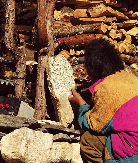 Шерпа высекает молитвы на камне. Продуктами труда таких умельцев украшена вся тропа к Эвересту.