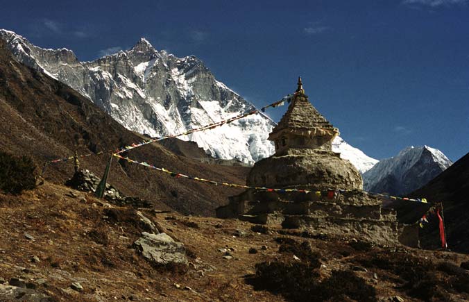 Ступа над деревней Дингбоче в верховьях Имджи. На заднем плане величественная стена Лхотце (8516 м). Небольшая гора по соседству - популярный среди состоятельных альпинистов-любителей Айланд пик, или Имджатце, (6189 м), с вершины которого открывается потрясающая панорама гигантских отвесных скальных стен, местами покрытых снегом и спрессованным до синевы льдом: Лхотце на севере, Ама Даблам - на юг-западе.