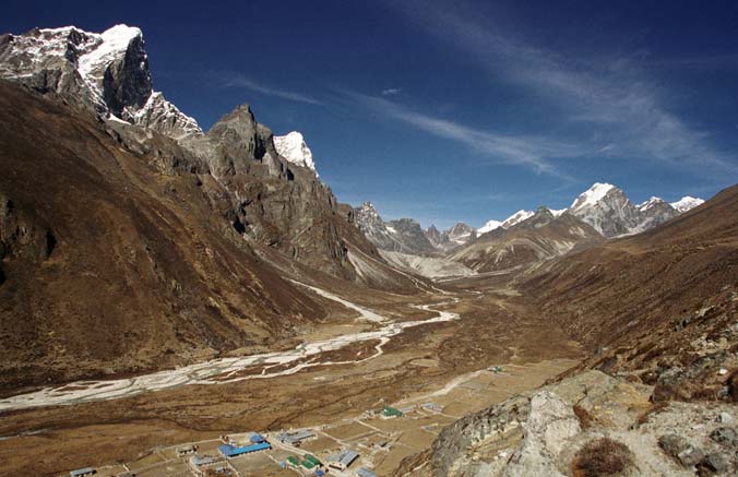 Долина реки Лобуче и селение Пхериче (4250 м). Якро белая гора - самая дальняя на снимке, небольшой белый выступ - это огромная снежная Чо Ойю (8201 м) на границе с Тибетом.