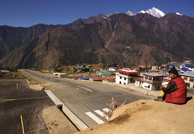 Взлетно-посадочная полоса аэропорта Луклы (2860 м). От Катманду сюда 25 минут страха и восторга в летающем "ПАЗике". В противном случае день на автобусе и неделя пешком. Посадка на этот наклонный тротуар не забудется никогда.