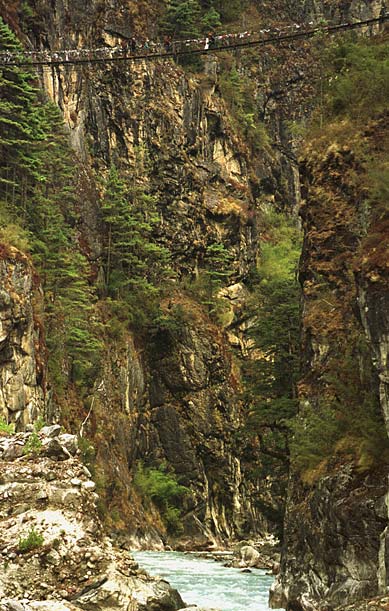 Мост у слияния Дудха и несущейся с запада Бхоте (Bhote Kosi) висит над пропастью на высоте 120 метров. Построен швейцарцами в 1989 году, так что, наверное, прочен, и уж совершенно точно устойчив к нередким для этих мест катаклизмам. Увешан молельными флагами, как обычно. Впечатляющее зрелище. За мостом начинается царство Кхумбу (Khumbu) – страны шерпов, названной по одноименному леднику Эвереста.