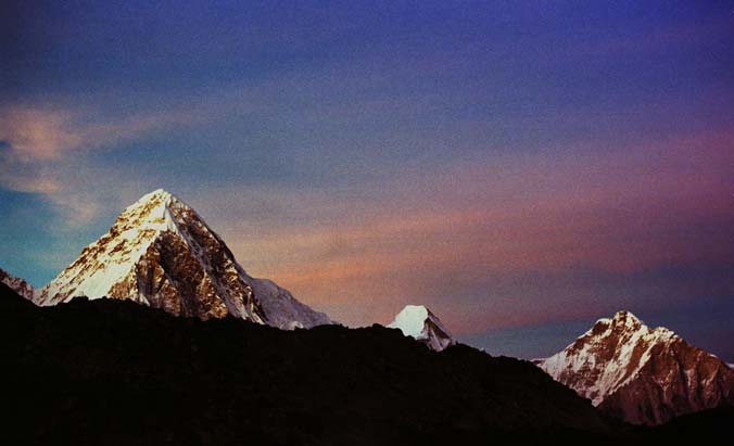 Пумори (7165 м). Очень красива и почти неприступна. За ней - Тибет. Из Лобуче Пумори почти не видна, хоть до ее подножия ходьбы всего пару часов. Но если чуть подняться над деревней, потрясающий закат заставит забыть о ледяном вечернем холоде.