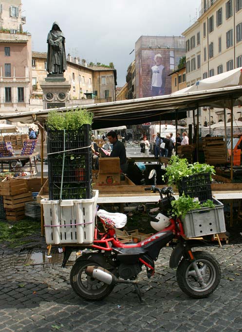Площадь Кампо-де-Фьори в Риме - рынок и памятник Джордано Бруно.