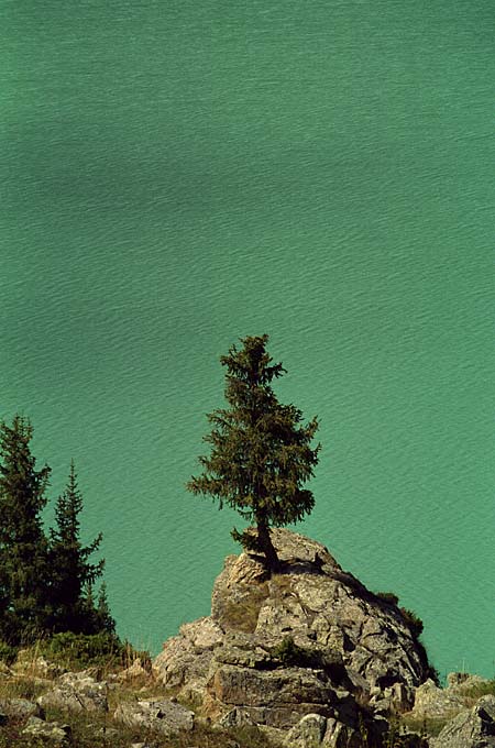 Дерево на скале над Большим Алма-Атинским озером. В ясный день вода действительно такого цвета.