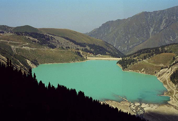 Высокогорное Большое Алма-Атинское озеро. К озеру ведет дорога из Алма-Аты через ущелье Большой Алма-Атинки - Алмаарасан. От круга на пересечении Аль-Фараби и Навои отходят автобус и маршрутки. От конечной остановки еще 8 км по ущелью до японской плотины и ГРЭС, там начинается труба - ее издалека видать. Местные шагают прямо по ней, но можно и не понимать столь дословно указание "подниматься по трубе" и карабкаться рядышком. Первая часть пути очень крутая, потом подъем выполаживается. Час - и вы на озере. Можно и на машине или на автобусе от центрального стадиона, но дорога длинная и убитая, а мосты разрушены. На фотографии видна плотина и две дороги - одна уходит наверх, к обсерватории (едва различимая группа зданий в верхней левой части снимка), где можно заночевать и поглядеть на луну и звезды в телескоп. Если подняться дальше - дойдете до космостанции. Бог ее знает, почему она так называется, но оттуда открывается потрясающий в соседнее ущелье (панорама - здесь). Другая дорога, от плотины по берегу - в Киргизию, к озеру Иссык-Куль. Проехать по ней на машине нереально, но пешком и на велике - легко. Один перевал 3500 м, второй - 4000 м. Три дня пути, на велике народ за день ездит. Проходима с середины июня по конец сентября.