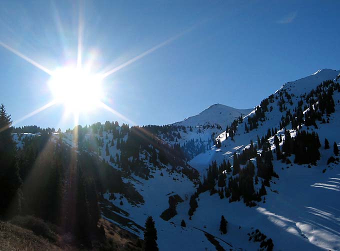 Ущелье к востоку от Чимбулака. На заднем плане - сопка Фурмановка (3000 м). Подъем на нее от знаменитого катка Медео, что под Алма-Атой, занимает три-четыре часа, надо перед катком свернуть с дороги налево, в сторону какого-то национального ресторана и водоочистных сооружений. Потом по тропе - наверх. Весной подняться можно только ранним морозным утром - по насту, в противном случае купание в снегу гарантировано (смотрите сами - здесь). Зато виды отличные, даже с полдороги (панорама - здесь). Летом с Фурмановки можно отправиться дальше - на пик Панорама, а оттуда через Чимбулачку (рассказ про нее - здесь) на Талгарский перевал. Там впрыгнуть на канатку (вниз - бесплатно), и прохалявить 1000 м спуска.