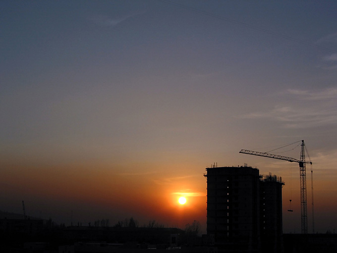 Закат в Алма-Ате. Город понемногу застраивают "элитными и эксклюзивными" высотками, закрывая все горные виды жителям немодных домов. Но это еще что - огромные яблочные сады в предгорьях, давшие имя "отцу яблок" Алма-Ате, вырубили в угоду семье президента, многочисленные члены которой разместили там очередные "элитные и эксклюзивные" постройки.