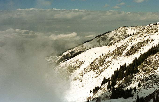 Облака отступают в степь. Вид с Талгарского перевала. В такие моменты Чимбулак - лучшее место в Алма-Ате. Полчаса езды по прекрасной горной дороге - и вы над облаками. Население же гниет под дождем или откапывается из-под снега. Несмотря на доступность и очевидность этого места, большинство алма-атинцев на Чимбулаке вообще ни разу не были.