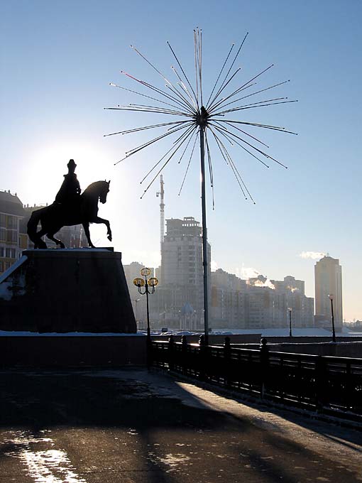 Набережная реки Ишим в новой столице Казахстана - Астане. Зимой тут жуткий дубняк, летом - страшная жара. Ураганные ветра, жирнючие комары и причесанные фасады гнилого нутра бывшего Целинограда. Одно из немногих развлечений переселенных в степь из теплой Алма-Аты чиновников и местных жителей - прогулка по набережной, которую все называют "5 минут Голливуда". Тут и министра встретишь, и депутата. Их забота о жителях новой столицы не знает границ: недавно открыли в степи океанариум, обещают даже завезти акул из Китая.