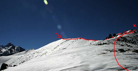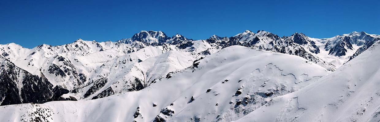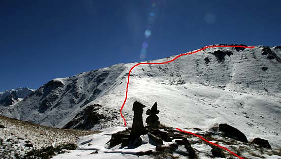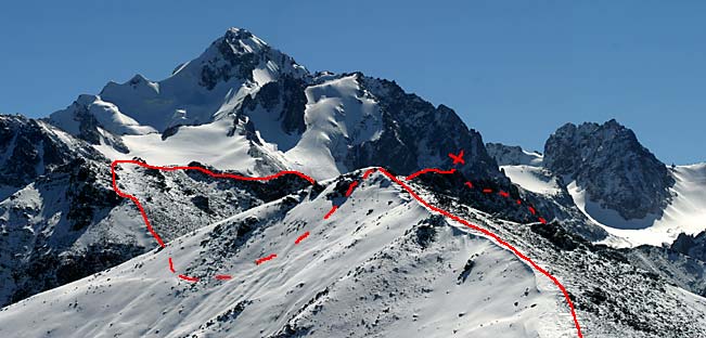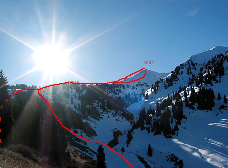 Шагаете по ребру, спускаетесь на перевал (невидимая часть маршрута помечена пунктиром), откуда карабкаетесь метров 150 по крутой, противной, но выносимой осыпи. Дальше - между скал к вершинке, отмеченной крестом. Ее темный контур едва выделяется на фоне стены пика Чкалова. Пунктир ведет на Талгарский перевал, откуда, прошагав 3,5 км и сбросив при этом 1 км по вертикали, попадете на Чимбулак. Если повезет - сэкономите силы, но не время, прокатившись на канатке. Подробно путь от Чимбулака до Чимбулачки описан здесь.