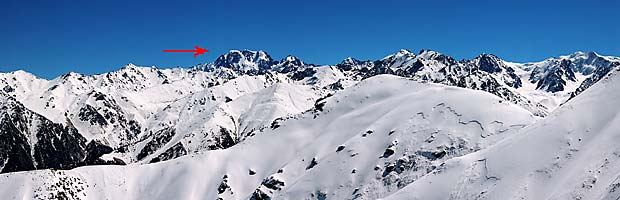 Крестиком помечена промежуточная вершина, стрелкой - пик Панорама (3400). В углу маячит массив пика Комсомола. С Панорамы - один из лучших видов на него во всей округе. Вот она, та самая панорама: