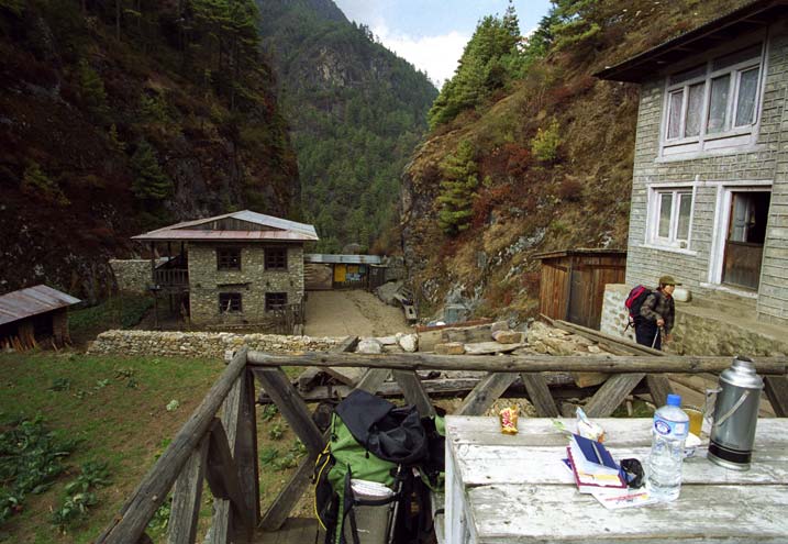За КПП тропа уходит в глубокое ущелье, минует деревню Джорсале (Joresale/Thumbug), 2810 м, пару раз пересекает Дудх и карабкается вверх к 120-метровому мосту, построенному швейцарцами в 1989 году. Мост у слияния Дудха и несущейся с запада Бхоте (Bhote Kosi) необычайно высок – ради устойчивости к катаклизмам – потому подъем на него требует усилий. Увешан молельными флагами, как обычно. Впечатляющее зрелище. За мостом начинается царство Кхумбу (Khumbu) – страны шерпов, названной по одноименному леднику Эвереста.