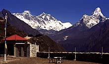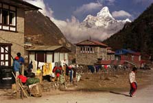 * На восток от Чой Ганга живописная тропа через полтора часа приводит в небольшую деревню Кьянгджума (Kyangjuma), 3600 м, откуда уходит налево и вверх к довольно крупному и значительному поселению, сохранившему первозданный шарм культуры шерпов – Кхумджунгу. По пути в Кьянгджуму можно встретить гималайского горного козла - тара (Hemitragus jemlahicus).* Кхумджунг (Khumjung), 3780 м, населенный преимущественно зажиточными шерпами, известен начальной школой, основанной сэром Эдмундом Хиллари. В 1983 году основанный им Гималайский траст расширил учебное заведение для шерпов, открыв в Кхумджунге среднюю школу. Деревня стоит у подножия священной горы Кхумбила (Khumbila), 5761 м. Буддийский храм (гомпа) в Кхумджунге построен в 1831 году и легендарен тем, что в нем хранится скальп йети (снежного человека). Правда, в 1960 году Хиллари со товарищи отвез скальп на экспертизу в США, и американцы назвали его поделкой из шкуры козла. В Кхумджунге можно отведать пирожных и кексов в местной булочной-кондитерской. Прекрасный вид на Ама-Даблам (на фото). |