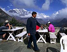 * От источника у ступы отходит тропа к самому фантастическому заведению всего Кхумбу – четырехзвездочной гостинице Everest View Hotel. Выстроенная японцами 12-комнатная гостиница с номерами по $200 за ночь, кислородом и повышенным давлением в комнатах предназначена в основном для богатых японцев же, которые прилетают на расположенный в 20 минутах ходьбы аэродром Сьянгбоче и в кислородных масках наслаждаются видами Эвереста, Лхотце, Нутпце и Ама Даблам. Шерпы, таскающие воду в гостиницу из Кхумджунга, до сих пор не могут осознать, как человек способен отдать такие деньги за ночлег. При гостинице есть терасса и кафе (на фото), весьма дешево, прекрасные виды. Внутри - макет Кхумбу из папье-маше. |