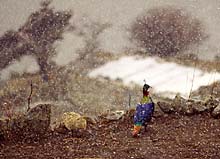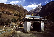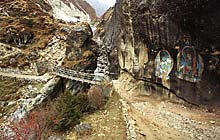 В самом Тхамо находится контора электроэнергетической компании Khumbu Bijuli Company. Компания управляет распределительной сетью, по которой электричество поступает в Намче, Тхаме, Кхумджунг, Кхунде и более мелкие поселения, а также заведует австрийской гидроэлектростанцией, построенной со второй попытки. Остатки первой – так и не достроенной – станции еще видны на противоположном берегу Бхоте. В 1985 году ее смыло волной разлившегося ледникового озера. Новую станцию поставили выше по течению – в Тхаме. До Тхаме из Тхамо можно пройти прямо, затем пересечь Бхоте по временному мосту и посмотреть электростанцию – две турбины, несколько генераторов мощностью 630 кВт в небольшом здании, украшенном в традиционном стиле, километровая труба диаметром 600 мм спускающаяся на 200 метров. Всем заправляет один шерпа, практиковавшийся в Австрии. Там же, по рассказам, жил (а может, и до сих пор живет) русский человек Алексей Герасимов, рисует и фотографирует, прозябает, в общем. Другой путь из Тхамо в Тхаме ближе к природе, а не к технике: сразу за последними домами Тхамо надо лезть наверх по каменным ступеням до храма Кхари (Khari Gompa), потом еще выше до небольшой древни Сомде (Somde), 3580 м. Поднявшись еще немного по краю долины, тропа спускается к железному подвесному мосту и росписи на каменном обрыве, откуда до Тхаме рукой подать. От Сомде открывается чудесный вид на гору Теси Лапча (Tesi Lapcha), 5755 м, и возвышающийся над ней пик Пхарчамо (Pharchamo), 6187 м. Из самого Тхаме хорошо видны долина Бхоте и снежные пики Тенг Кангпоче (Teng Kangpoche), 6500 м, и Квангде (Kwangde), 6187 м. |