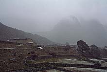 У первой деревни – Пхурте (Phurte) – заповедная зона, где под патронажем все того же Гималайского траста выращивают деревья для восстановления лесного покрова нижних районов Кхумбу. Следующая деревня – Тхамо (Thamo/Thammu/Dramo), 3440 м. По пути туда на склоне выше основной тропы можно заметить небольшой монастырь – Лаудо (Laudo). Это построенное в 1970 году подворье монастыря Копан, что в районе Бодхнатха в Катманду, и медитируют там в основном иностранцы, под преводительством англоговорящего ламы. Перед мостом через реку - кани - расписная арка с молельными барабанами.