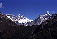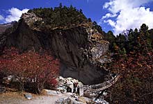 Дорога к храму из Намче ведет на восток, мимо полицейского участка и дальше через Кьянгджуму, совпадая с маршрутом первого акклиматизационного дня в Намче. Монастырь виден почти сразу - на хребте точно посредине панорамы. Не сворачивая с тропы налево, к Кхумджунгу, примерно через полтора часа тропа приводит в деревню Санаса (Sanasa), 3580 м, населенную преимущественно тибетцами. От этого и обилие сувениров, якобы тибетского происхождения. Вполне очевидная тропа за Санасой немного петляет по склону, а затем спускается к довольно крупной деревне Трашинго (Trashingo) и дальше вниз, через лес к мосту через Дудх, подвешенному чуть ниже по течению от места слияния Дудха и Имджи (Imja Khola). Это самый низкий отрезок пути от Намче – здесь всего 3250 м, а впереди 620-метровый подъем к монастырю, на котором не редки встречи с кабаргами и тарами. За мостом в деревне Пхунки Тенга (Phunki Tenga), 3250 м, – молельные барабаны, приводимые в движение водой. За ними начинается подъем, поначалу крутой, затем более пологий. Отсюда открывается величественный вид на стену Квангде, возвышающуюся над скрытым от взгляда Намче. Долгий путь наверх выводит к расписным воротам монастыря – арке, именуемой кани, призванной очистить ступающего на святую землю от духов сомнения, страха и зла. Через минуту появится ступа, а рядом с ней и монастырь. Говорят, из Тенгпоче открывается самая потрясающая в мире горная панорама. Тот, кто пойдет дальше, увидит горы ближе, но не лучше. Отсюда видны Квангде, Тавачи (Tawachee, 6542 м), Эверест (Everest, 8848 м), Лхотце (Lhotse, 8501 м), Нуптце (Nuptse, 7879 м), Ама Даблам, Кантега (Kantega/Kangtaiga, 6779 м) и Тхамсерку. Глядя из Тенгпоче на Кантегу становится понятно, почему она получила имя, означающее “седло лошади”. В Тенгпоче помимо монастыря есть пять гостиниц, три из которых принадлежат монастырю. Места для палаток также контролируются монахами, которых в монастыре около 60; они собирают деньги с расположившихся трекеров и могут не пустить на забронированные для групп площадки. Устроиться на ночлег в Тенгпоче во время недельного фестиваля Мани Римду практически невозможно. Фестиваль проходит в полнолуние октября-ноября (в Тхаме – в мае). Так же людно здесь и в субботу вечером после традиционного базара в Намче. Как вариант можно рассмотреть размещение в соседних деревнях – дальше по маршруту. |