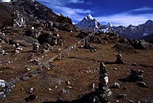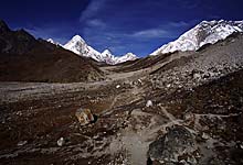 Холм за Туглой – непрострое препятствие, особенно с тяжелым рюкзаком. Близость к Эвересту становится все более очевидной: в конце подъема, на 4840 м, в ряд выстроились памятники шерпам и альпинистам, так и не спустившимся вниз. Первым появился здесь памятник шести шерпам, убитым лавиной во время японской лыжной экспедиции на Эверест в 1970 году. До Лобуче отсюда около часа пути по пологому склону среди почти сошедшей на нет растительности и покрытых льдом проток. Долину ледника Кхубму замыкают Пумори (Pumori, 7165 м), Лингтрен (Lingtren, 6179 м) и Кхумбутце (Khumbutse, 6665 м), за которыми – Тибет. Эверест на этом отрезке пути закрыт юго-западной стеной Нуптце, и он не появится до Горак Шепа. В Лобуче несколько гостиниц; цены вдвое выше чем в Намче. Ночи здесь очень холодные – даже в октябре температура не поднимается выше нуля – и посему трекеры с палатками стараются забиться в гостиницы, создавая иногда проблемы с размещением. Впрочем, на улице вы не останетесь. На этой высоте (почти 5000 м) уровень кислорода в крови много ниже обычного, поэтому согреться сложнее. Вам точно потребуется теплый спальник и пуховые одежды на вечер. Сидеть в гостинице все время тоже не будешь, потому что ввиду объяснимого недостатка топлива шерпы коптят сушеным навозом, и едкий дым скапливается в плохо проветриваемых тесных помещениях. Недалеко от Лобуче итальянцы десять лет назад построили так называемую Пирамиду – исследовательский центр. Центр бывает открыт для трекеров, и там можно даже переночевать, если пустят. Там есть медпункт, туалет и настоящий душ. От итальянцев можно позвонить домой за $13/мин. Из Лобуче можно подняться по склону, откуда хорошо смотреть закат - на эту высоту облака обычно уже не забираются. Не редкость увидеть здесь бегающих друг за другом по склону уларов, а в небе – парящих гигантов с удивительными названиями: ястреб-тетеревятник, бородач-ягнятник, гималайский гриф и беркут. Говорят, здесь живут снежные леопарды и, конечно, йети. |