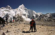 По пути к базовому лагерю встретится череда каменных ступ, знаков и надписей в память о погибших на Эвересте, в том числе здесь начертаны имена жертв пока самой страшной катастрофы за всю историю покорения горы – массовой гибели участников двух коммерческих экспедиций 1996 года и их руководителей, известных альпинистов Роба Холла и Скота Фишера. Инструктуром в команде Фишера тогда был Анатолий Букреев, благодаря которому окончательный список погибших оказался намного короче, чем мог бы быть. Желание многих подняться в базовый лагерь понятно. И не будем их переубеждать. Между тем, гораздо более популярным времяпрепровождением для достигших Горак Шепа традиционно было восхождение на близлежащий холм, откуда открывается бесспорно лучший из доступных простому трекеру видов на Эверест и близлежащие пики. Кала Паттар в переводе с хинди – “черная скала”. Говорят, его так назвал шерпа Дава Тензинг, провожая наверх первого иностранца, Джимми Робертса. Они общались между собой не по-непальски, а на хинди. Из Лобуче до Горак Шепа примерно два-три часа, до двух часов занимает подъем на главную вершину Кала Патара. Даже для хорошо подготовленных товарищей поход на Кала Паттар и к месту базового лагеря Эвереста в один день представляется затруднительным. Чтобы встретить рассвет на Кала Паттаре, нужно выйти из Лобуче очень рано - часа в три утра, в космический холод, - и знать дорогу. Утром небо обычно безоблачно, поэтому в любом случае снимайтесь пораньше. Поход из Лобуче на Кала Паттар и обратно занимает максимум около восьми часов. Погода на вершине обычно хорошая, однако, бывает, что к 10-11 утра там поднимается страшный ветер. В любом случае, ветрозащитную и даже пуховую одежду, очки, шапку и перчатки лучше взять сразу, чтобы потом не возвращаться. Определить два дня на Кала Паттар – лучший вариант, ведь погоде не прикажешь. Можно, конечно, сбегать наверх в предыдущий акклиматизационный день, а на сегодня, если захочется, рвануть еще разок, уже утром. Стоит только прислушаться к своему состоянию и к хозяевам чайных в Горак Шепе. |
