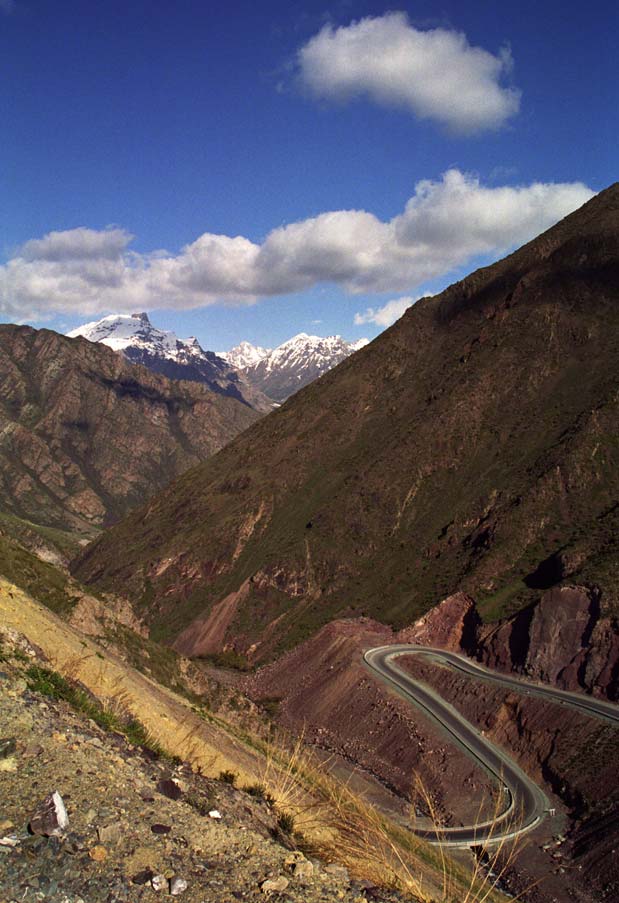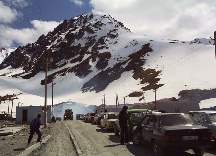 | Ущелье глубокое, скалы постоянно осыпаются, иногда прямо на дорогу, так что аккуратнее на поворотах, и верьте заботливо установленным знакам - если нарисована кочка, то она там обязательно есть, причем огромная. Дорога, повиляв прилично, начинает серпантином подниматься к первому перевалу - Тёо-Ашуу, что на высоте примерно 3200 метров. Раньше он был выше, но теперь прорыли тоннель из одного мира в другой, страшную коптящую кишку, похожую на подземелья Мории. Тоннель в мае 2002 года был на ремонте и имел гадкое обыкновение открываться только с двух дня до десяти вечера, осложняя путешествие через Киргизский хребет. |