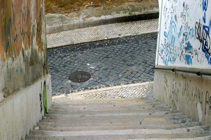 Улица в Альфаме в Лисабоне. Вот там все так: булыжник, плитка, стертые ступени, графити.