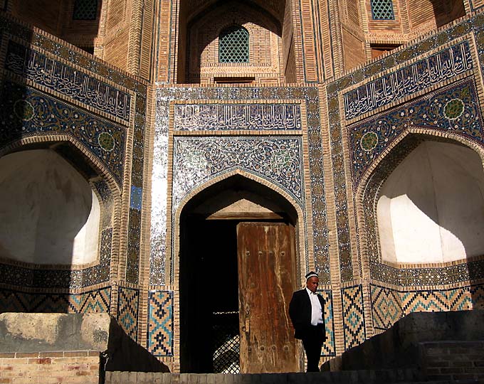 Узбек у входа в медресе Мири-Араб в Бухаре.