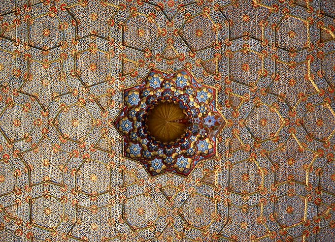 Резной расписной потолок терассы в мемориале Бахауддина Накшбанди, основоположника суфизма - течения аскетов в исламе. Аскетизм аскетизмом, а потолок вон какой.
