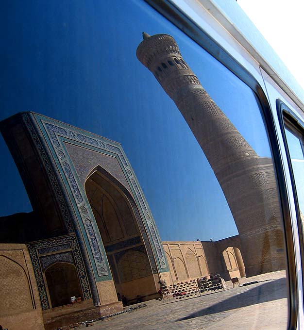 Мечеть и минарет Колон в Бухаре отражаются в окне автомобиля.