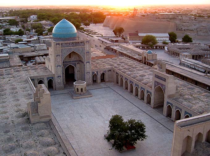 Вид на Бухару с минарета Колон. Внизу - двор одноименной мечети. Чуть поодаль - массивные стены цитадели Арк, частично восстановленные лишь недавно, к очередному юбилею. Когда-то Арк был зимней резиденцией Бухарского эмира. В порыве революционной борьбы с басмачами большевики во главе с Фрунзе превратили 80 процентов площади Арка в бессмысленную груду камня. Частично сохранившиеся 20 процентов скоро разрушит время.