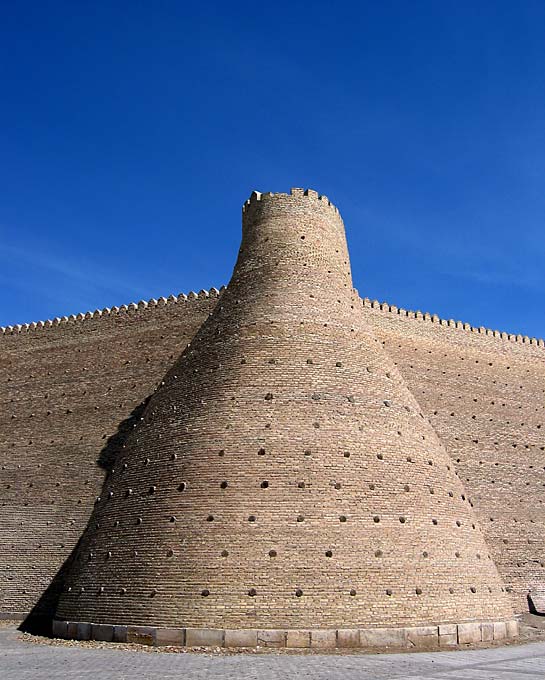 Бастион цитадели Арк в Бухаре. Эту часть крепостной стены спешно отреставрировали к юбилею 1997 года. Кладке всего пять лет, но она уже осыпается, что хорошо заметно по зубьям на верхушке башни. Вид сверху - здесь.