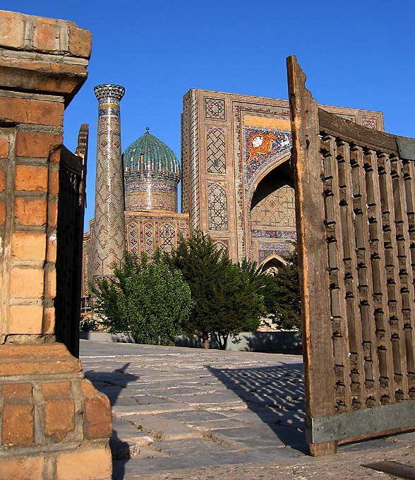 Калитка на площади Регистан в Самарканде. Вход с заднего двора на главную площадь города приятнее - от мечети Бибиханум сюда ведут тихие улицы, контрастирующие с огромными проспектами современного Самарканда.
